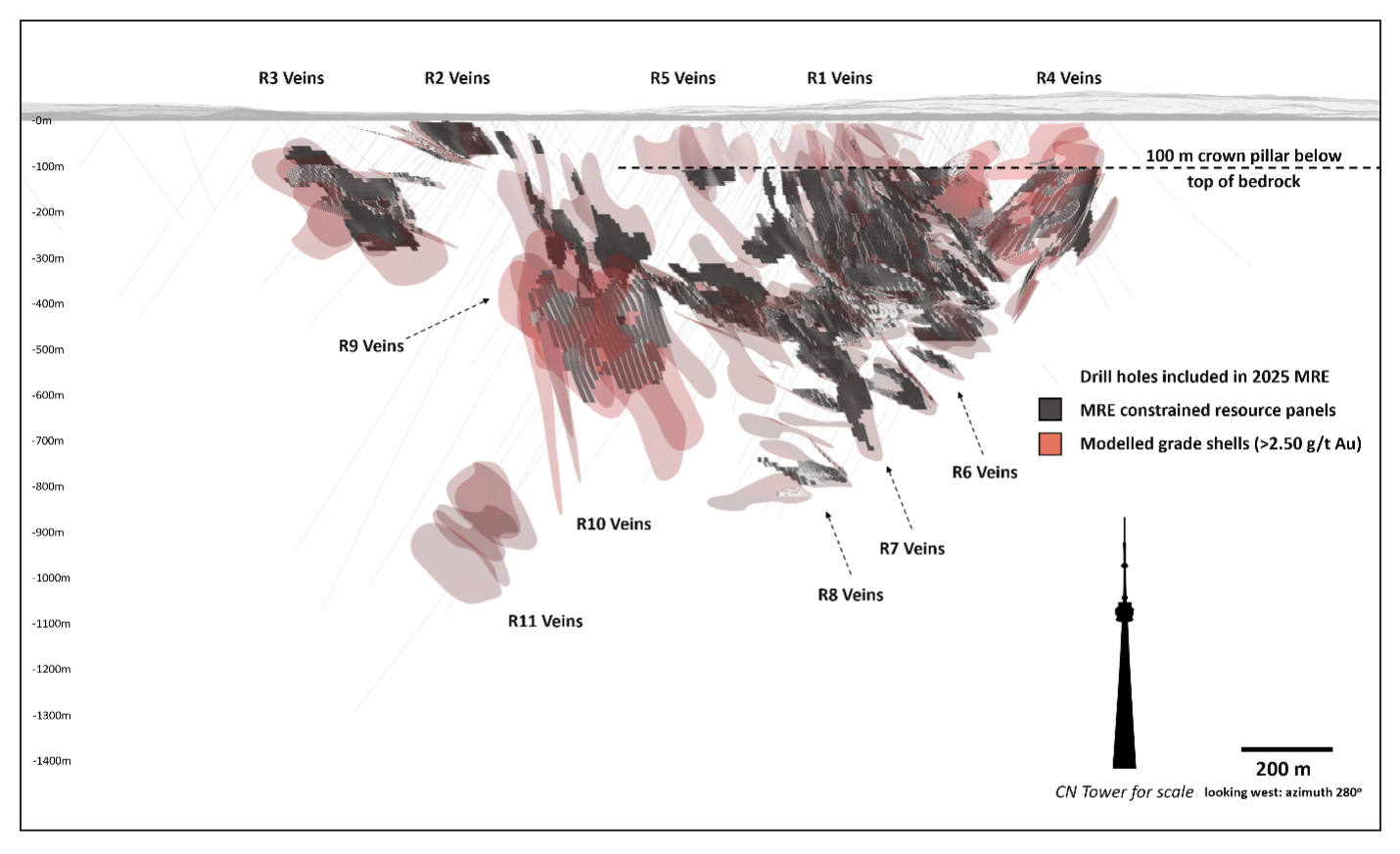 La première estimation des ressources minérales (« ERM ») intègre tous les forages réalisés jusqu'à la fin du programme hivernal 2025, soit 289 trous de forage au diamant totalisant 127,217 mètres. Les coquilles de teneur modélisées, chacune soutenue par au moins trois trous de forage espacés d'environ 100 m, comprennent 92 veines à haute teneur définies à l'aide d'un seuil de coupure de 2.50 g/t Au, ainsi qu'une enveloppe plus large à faible teneur comprenant 91 veines à un seuil de coupure de 0.30 g/t Au.