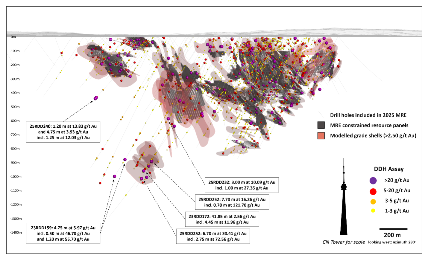 - Dans la tendance modélisée R11 : 6,70 m à 30,41 g/t Au, dont 2,75 m à 72,56 g/t Au (25RDD252) ; 7.70 m à 16.26 g/t Au, dont 0.70 m à 121.70 g/t Au (25RDD252) ; et 4.45 m à 11.96 g/t Au (23RDD172)1,2