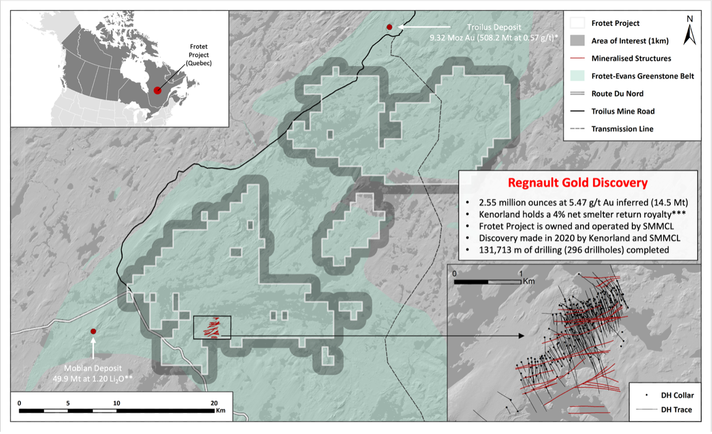 Vancouver, Colombie Britannique, 16 décembre 2025 – Kenorland Minerals Ltd. (TSXV : KLD) (OTCQX : KLDCF) (FSE : 3WQ0) (« Kenorland » ou la « Société ») a le plaisir d'annoncer une première ressource minérale présumée de 14.5 Mt à 5.47 g/t pour 2.55 millions d'onces (Moz) d'or pour le gisement aurifère Regnault du projet Frotet (le « Projet ») dans le nord du Québec. Kenorland détient une redevance RNF de 4 % (la « redevance Frotet ») sur l'ensemble du projet, qui est détenu et exploité à 100 % par Sumitomo Metal Mining Canada Ltd. (« Sumitomo » ou « SMMCL »).